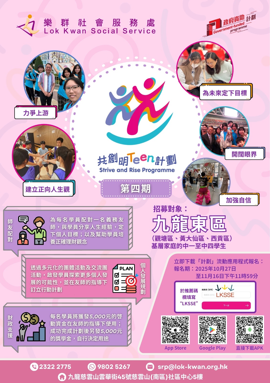 《行政長官2023年施政報告》宣布優化共創明『Teen』計劃,樂群社會服務處再度獲委任為九龍東(觀塘區、西貢區及黃大仙區)的地區營辦機構,透過「政、商、民」三方協作,聚焦扶助更多來自基層家庭的中學生。